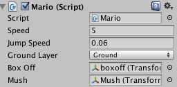 public float speed = 1.0f;public float jumpSpeed = 0.5f;public LayerMask groundLayer;private Animator marioAnimator;private Transform gCheck;private float scaleX = 1.0f;private float scaleY = 1.0f;void Start () {marioAnimator = GetComponent();gCheck = transform.FindChild(“GCheck”);}void FixedUpdate () {float mSpeed = Input.GetAxis(“Horizontal”);marioAnimator.SetFloat(“Speed”, Mathf.Abs(mSpeed));bool isTouched = Physics2D.OverlapPoint(gCheck.position, groundLayer);if (Input.GetKey(KeyCode.Space)){if (isTouched){rigidbody2D.AddForce(Vector2.up * jumpSpeed, ForceMode2D.Force);isTouched = false;}}marioAnimator.SetBool(“isTouched”, isTouched);if (mSpeed > 0){transform.localScale = new Vector2(scaleX, scaleY);}else if (mSpeed < 0){transform.localScale = new Vector2(–scaleX, scaleY);}this.rigidbody2D.velocity = new Vector2(mSpeed * speed, this.rigidbody2D.velocity.y);}