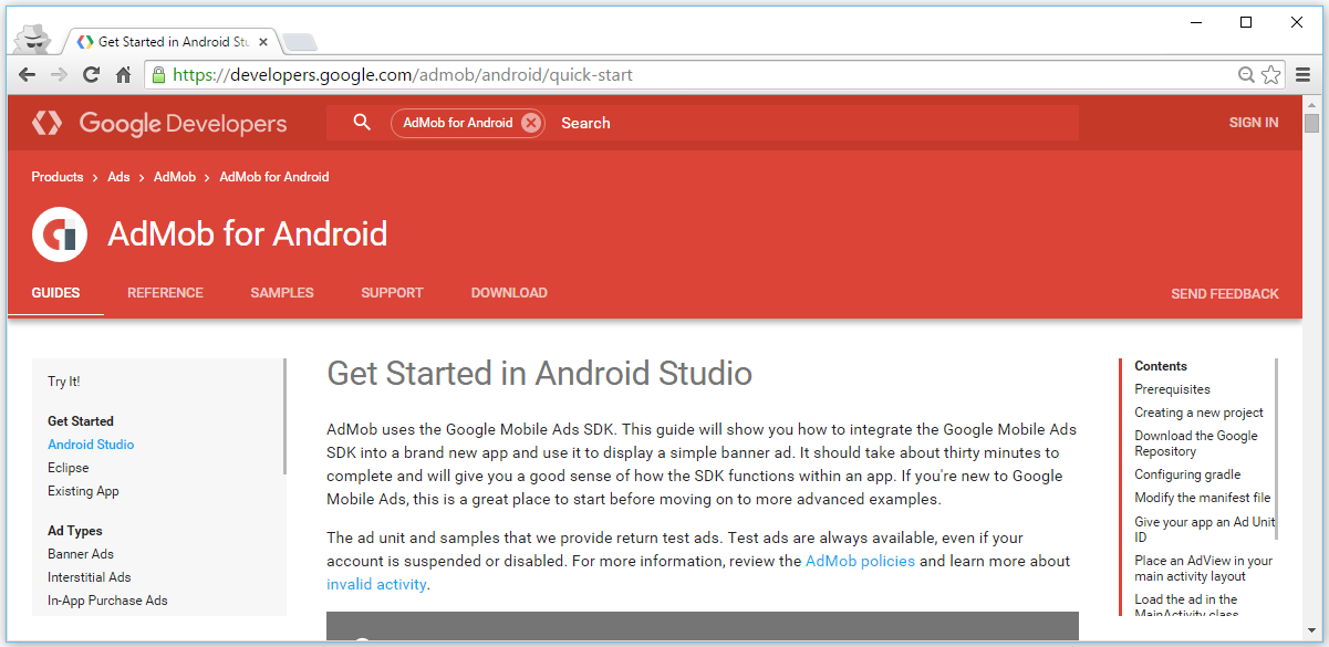 AdMob uses the Google Mobile Ads SDK. This guide will show you how to integrate the Google Mobile Ads SDK into a brand new app and use it to display a simple banner ad. It should take about thirty minutes to complete and will give you a good sense of how the SDK functions within an app. If you’re new to Google Mobile Ads, this is a great place to start before moving on to more advanced examples.