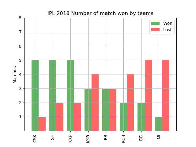 1 | <br />from bs4 import BeautifulSoup<br />import numpy as np<br />import pandas as pd<br />import matplotlib.pyplot as plt<br />import requests<br /><br />page = requests.get("http://www.cricbuzz.com/cricket-series/2676/indian-premier-league-2018/points-table")<br /><br />soup = BeautifulSoup(page.text)<br />#print(soup.prettify())<br /><br />tbl = soup.find("table",class_="table cb-srs-pnts")<br />#print(tbl.prettify())<br /><br />col_names = [x.get_text() for x in tbl.find_all('td',class_="cb-srs-pnts-th")]<br />col_names[5]='pts'<br />#print(col_names)<br /><br />team_names = [x.get_text() for x in tbl.find_all('td',class_="cb-srs-pnts-name")]<br />#print(team_names)<br /><br />pnt_tbl = [x.get_text() for x in tbl.find_all('td',class_="cb-srs-pnts-td")]<br />#print(pnt_tbl)<br /><br />np_pnt_tbl = (np.array(pnt_tbl)).reshape(len(team_names),7)<br />np_pnt_tbl = np.delete(np_pnt_tbl,6,1)<br />np_pnt_tbl = np_pnt_tbl.astype(int)<br />#print(np_pnt_tbl)<br /><br />consol_tbl = pd.DataFrame(np_pnt_tbl,index=team_names,columns=col_names)<br />consol_tbl.columns.name = "Teams"<br />print(consol_tbl)<br /><br />team_abr = []<br /><br />for team in team_names:<br /> short_form = ''<br /> for initial in team.split(' '):<br /> short_form = short_form + initial[0]<br /> team_abr.append(short_form)<br /><br /><br />title = 'IPL 2018 Number of match won by teams'<br />val_ticks = [1,2,3,4,5,6,7,8]<br />lost_ticks=[1.4,2.4,3.4,4.4,5.4,6.4,7.4,8.4]<br /><br /><br />plt.bar(val_ticks,np_pnt_tbl[:,1],width=0.4,color='g',alpha=0.6,label='Won')<br />plt.bar(lost_ticks,np_pnt_tbl[:,2],width=0.4,color='r',alpha=0.6,label='Lost')<br />plt.yticks(val_ticks)<br />plt.ylabel("Matches")<br />plt.xticks(val_ticks,team_names,rotation='vertical')<br />plt.grid(True)<br />plt.legend()<br />plt.title(title)<br /><br />plt.show()<br /><br /> |