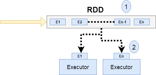 Elements of RDDs can be processed using foreach element loop. And then these elements will be distributed across executors in spark clusters.